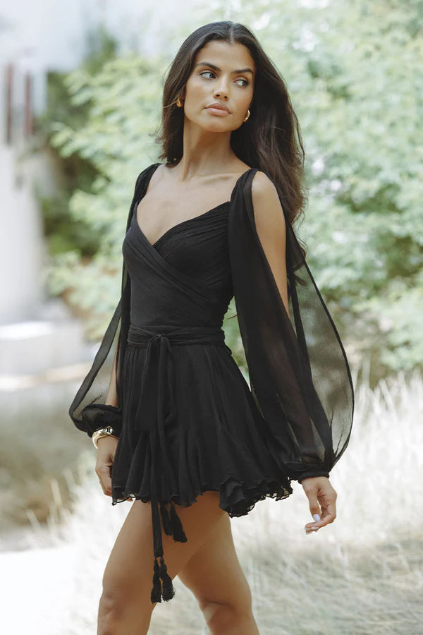 This delicate mini dress blends the ethereal feel of chiffon with a smooth silk lining to float effortlessly around you. The soft A-line silhouette gently skims the body, while the finely gathered waist and flowing skirt create a romantic, feminine shape. With its subtle V-neck and thin adjustable straps, the design is both elegant and versatile, ideal for weddings, dinner dates, or special night-outs.